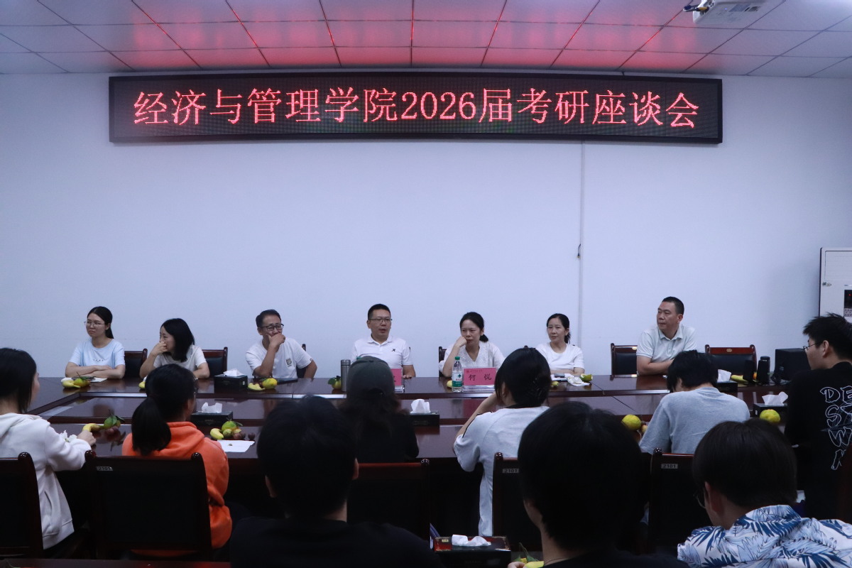 9月25日,经济与管理学院在明德楼召开2026届毕业生考研座谈会。学院党委书记谭明交、党委副书记何悦、副院长张斌儒及毕业生辅导员与备考学生展开深度交流,为30余名同学们答疑解惑、加油鼓劲。