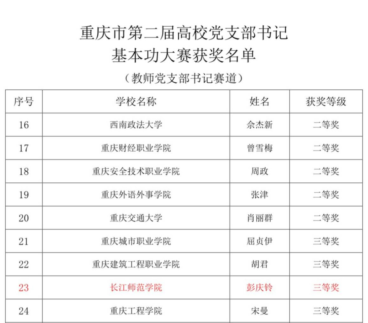 近日,为全面贯彻党的创新理论及重要指示精神,深入落实新时代党的建设总要求,重庆市委教育工委举办第二届高校党支部书记基本功大赛,大赛以“高度重视、组织有力,准备充分、以赛促训,成效显著、示范引领”为鲜明特点,全面展现了新时代高校党支部书记的政治素养与综合能力。我院支部书记彭庆铃凭借扎实的理论功底、过硬的实践能力和卓越的综合素养从135名优秀青年教师中脱颖而出,荣获三等奖,这既是个人能力的生动体现,也是学院党委深耕基层党建、强化支部建设的成果。