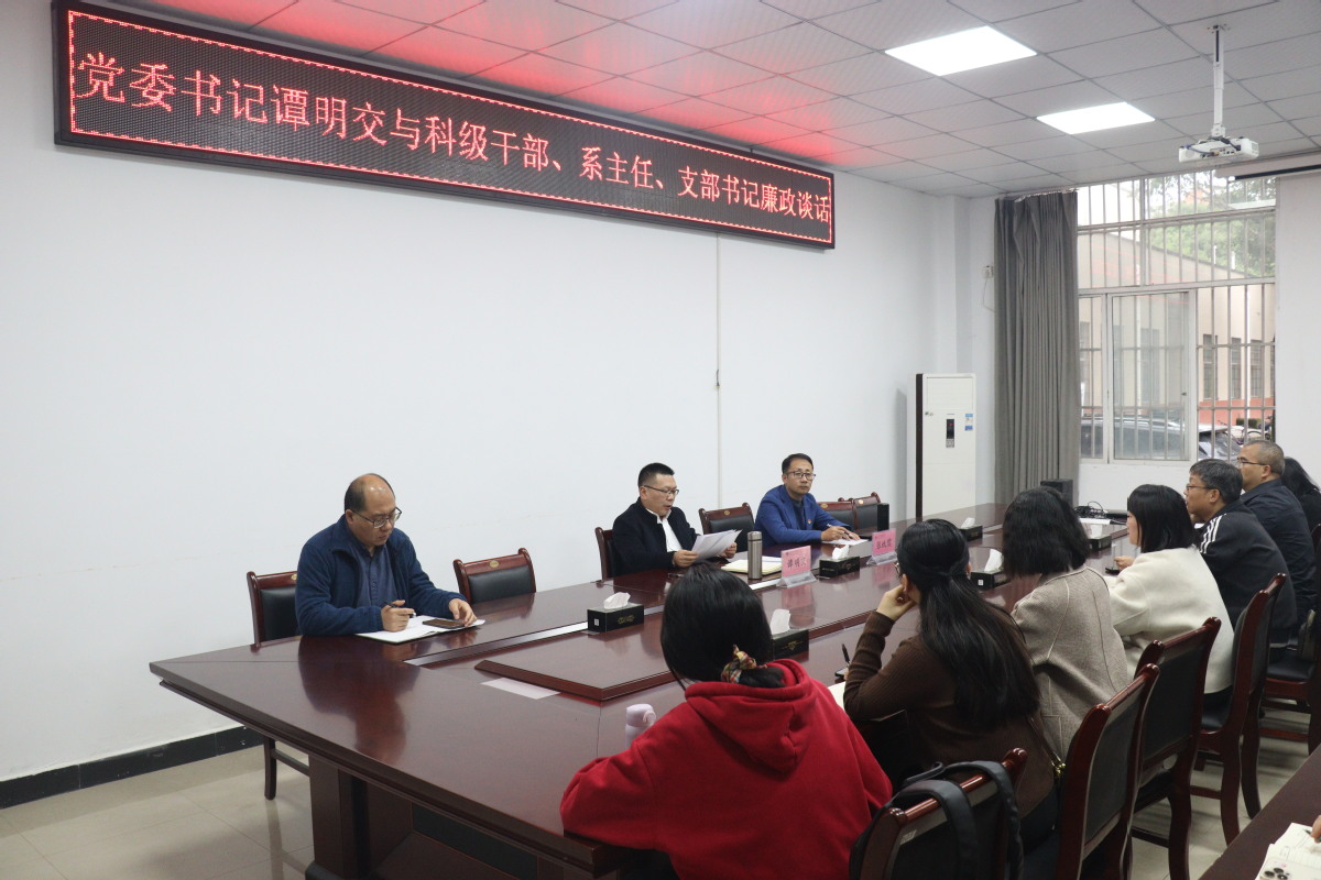 11月10日,经济与管理学院党委书记谭明交与学院科级干部、系主任、支部书记开展廉政谈话,学院纪检委员、副院长张斌儒出席会议,学院全体科级干部、系主任、支部书记参会。