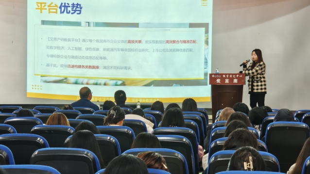 李欣欣介绍艾斯产研数据平台运营情况,指出平台集数值、数据资源与企业查询系统为一体,紧密围绕“产学研”需求搭建,为高校科研、学生论文写作提供数据支撑。