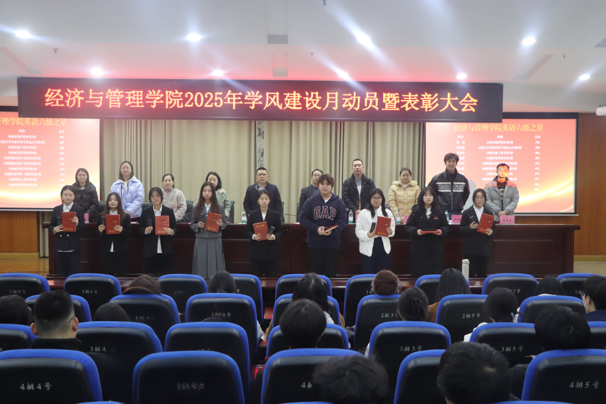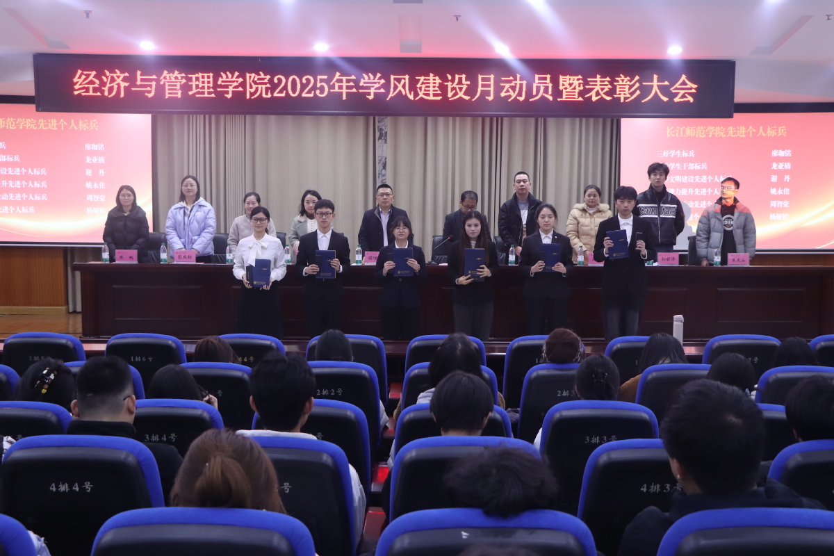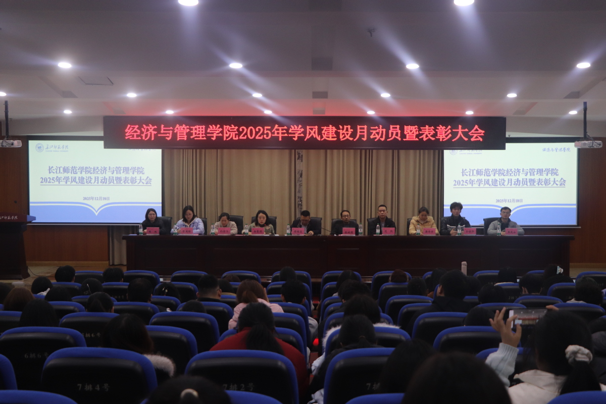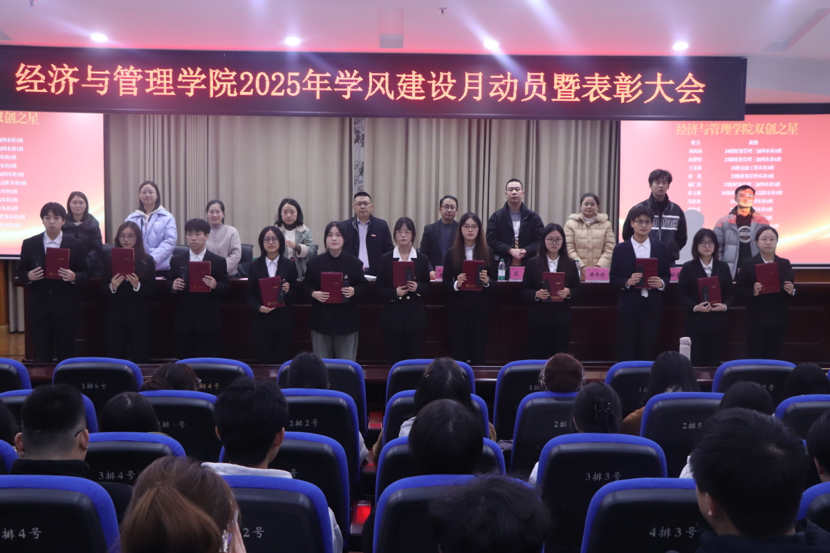 为充分发挥先进典型的示范引领作用,全面深化学风建设,12月10日晚,经济与管理学院2025学年学风建设月动员暨表彰大会在鉴湖学术报告厅隆重召开。学院党委书记谭明交、副院长张斌儒、团委书记冉雯瑞、全体辅导员以及各年级学生代表共同参会。