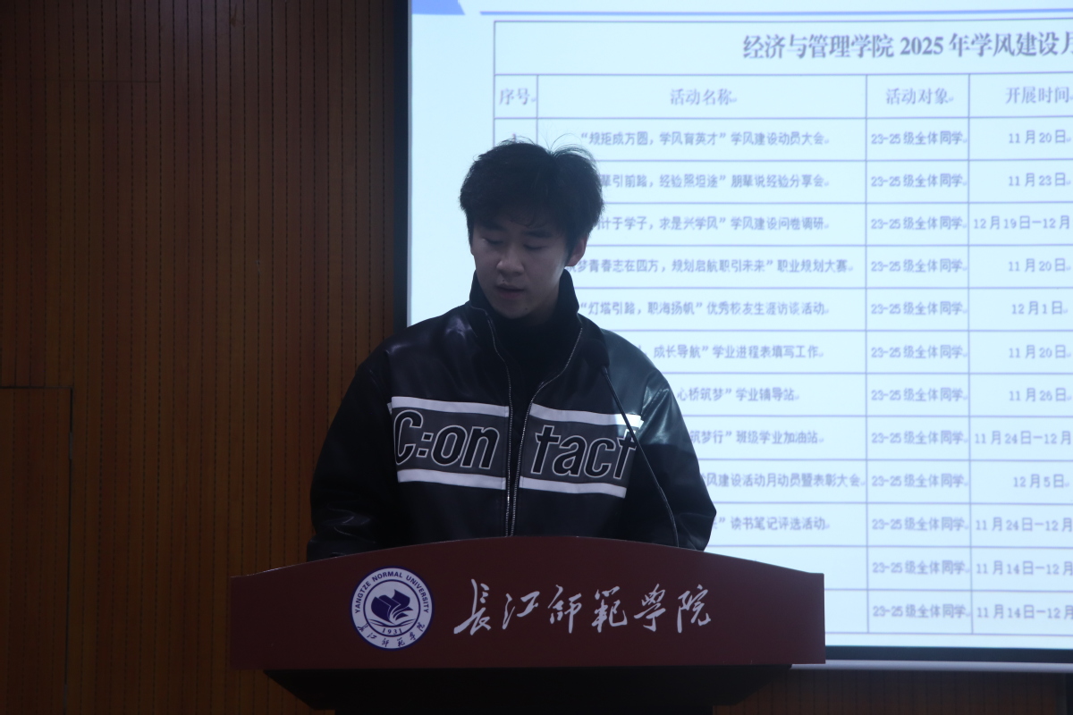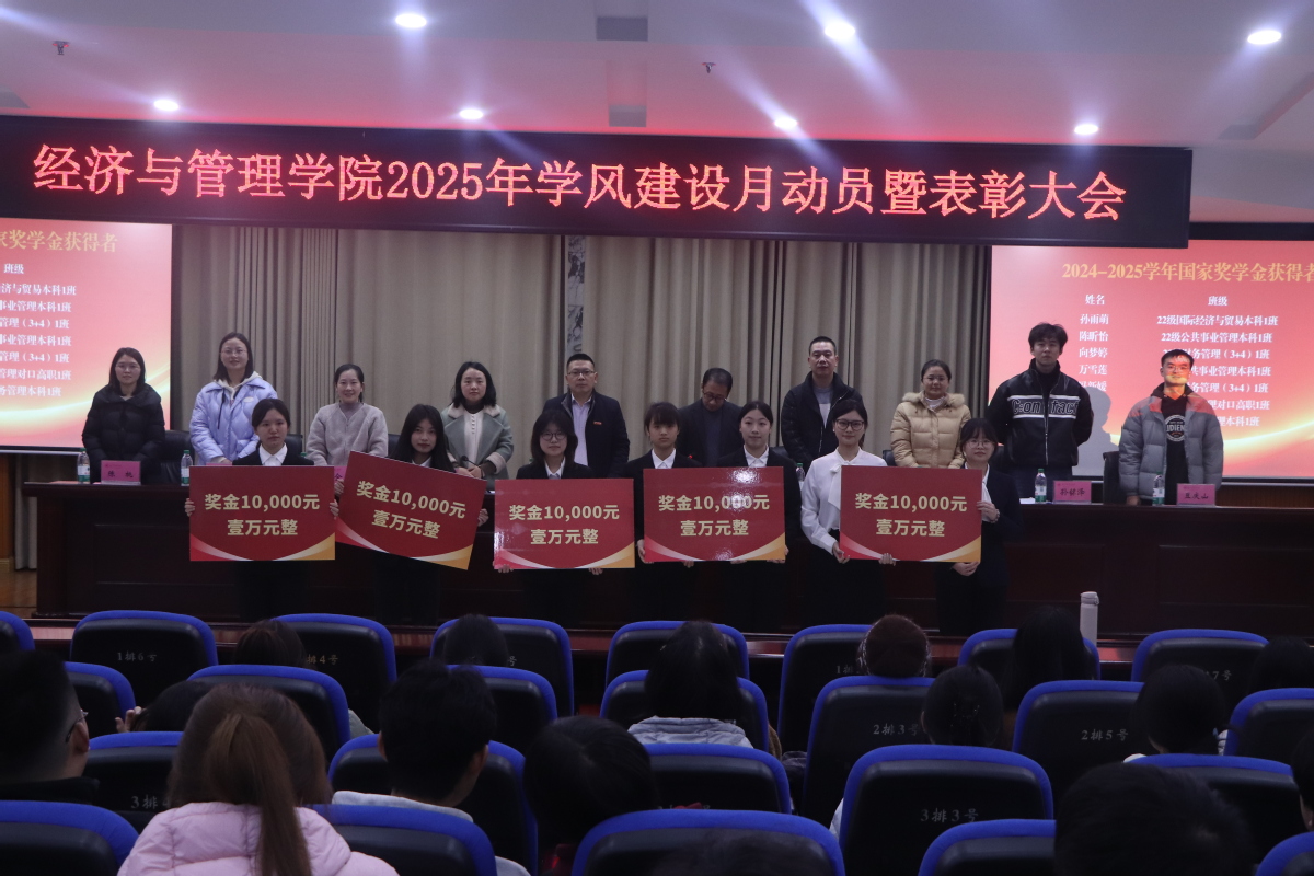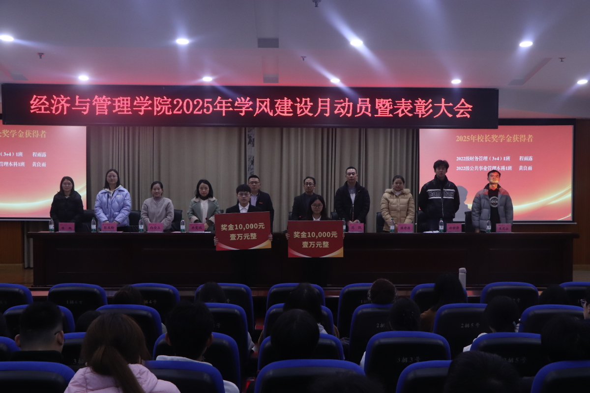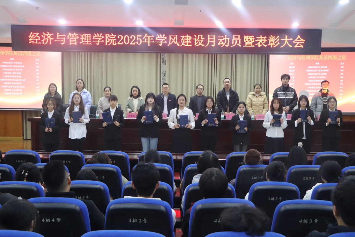 为充分发挥先进典型的示范引领作用,全面深化学风建设,12月10日晚,经济与管理学院2025学年学风建设月动员暨表彰大会在鉴湖学术报告厅隆重召开。学院党委书记谭明交、副院长张斌儒、团委书记冉雯瑞、全体辅导员以及各年级学生代表共同参会。