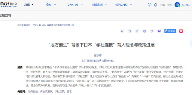 《比较教育研究》2025年第8期刊发了张秋菊博士的学术文章。该文指出,20世纪中后期,日本启动了“学校与地域社会连携”的教育探索路径;进入21世纪后,日本推出以促进地方内生式发展为宗旨的“地方创生”战略,同时将“学社连携”育人提升至新政策高度,两者构建了双向赋能、协同耦合的互动关系。“地方创生”战略为“学社连携”提供全方位支撑,“学社连携”则为地方可持续发展注入新动力。在此框架下,日本推动“学社连携”理念从学校与社会的“融合互补”深化为“一体化”方向。在社会层面,培育全社会协同育人的共同体意识;在学校层面,实现从“向社会开放”到“与地域共生”的定位转型。日本通过优化政策,推进学校民主治理、强化组织建设、完善政策协同机制、创新共育项目,以此促进“学社一体化”育人的实践进展。