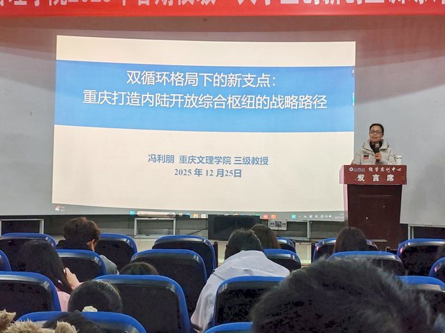 12月25日晚,经济与管理学院名师大讲堂第三期在学院3D实训中心顺利举行。本次讲座特邀重庆文理学院三级教授、博士后冯利朋担任主讲嘉宾,围绕重庆内陆开放综合枢纽建设展开深度解析,作题为“双循环格局下的新支点: 重庆打造内陆开放综合枢纽的战略路径”专题报告,学院物流工程专业2023至2025级全体学生及其他专业部分师生参与学习。