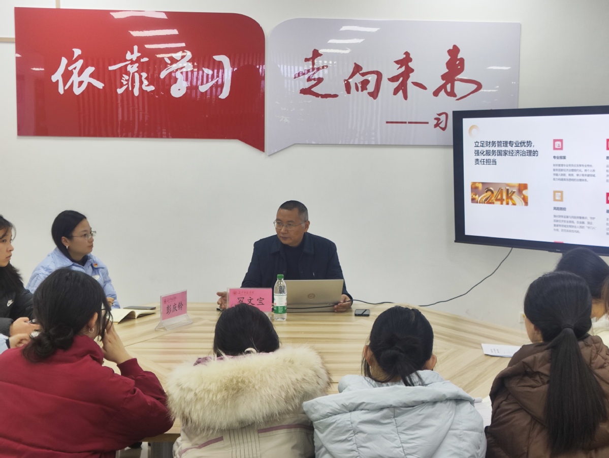 为引导财务管理专业学生党员深刻把握时代脉搏,将专业学习与国家战略需求紧密融合,书写新时代青年党员的合格答卷,2025年12月24日,学院财智初心学生党支部于社区综合服务大厅成功举办以“赓续红色使命,勇担时代重任”为主题的学习贯彻“十五五”规划专题党课。本次党课特邀学院党委统战委员罗文宝主讲,财智初心学生党支部全体党员及入党积极分子参加学习。