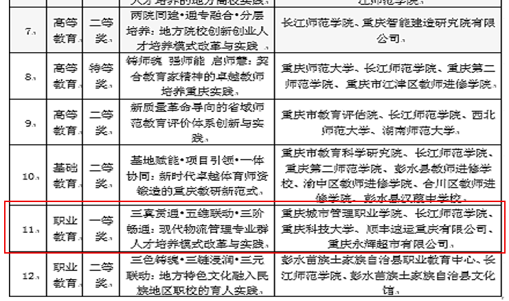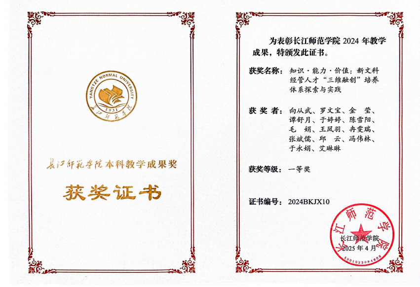 我院与重庆城市管理职业学院联合申报的教学成果《三真贯通·五维联动·三阶畅通:现代物流管理专业群人才培养模式改革与实践》荣获重庆市人民政府高等教育教学成果一等奖,该成果立足现代产业需求,创新构建“真实场景、真实项目、真实评价”相贯通、“课程、师资、资源、平台、机制”五维联动、“中职—高职—本科”三阶畅通的协同育人体系,有效提升了物流类人才的系统培养质量。学院聚焦新文科建设内涵,自主探索形成的《知识跨界·能力导向·价值引领:新文科经管人才三维融创培养体系探索与实践》教学成果获评校级教学成果一等奖,该体系以“三元互嵌”重构知识结构、以“三实协同”锤炼实践能力、以“双核联动”厚植价值根基,形成了可复制、可推广的新文科经管人才培养范式。两项成果充分彰显了我院在深化教育教学改革、推动高质量人才培养方面的创新力与影响力。
