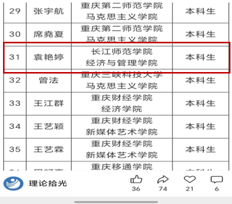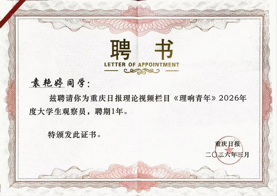 近日,重庆日报《理响青年》栏目第四批大学生观察员名单正式揭晓,我院2025级旅游管理专业袁艳婷同学凭借扎实的综合素养和突出的责任担当,从全国100余所高校的772份报名材料中脱颖而出,成功跻身40名观察员之列,成为本次我校唯一入选的学生代表。